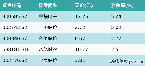 截至收盘股票配资服务,生物医药主题涨跌幅最高的五只股票为:奥联电子(300585.SZ)、三圣股份(002742.SZ)、科恒股份(300340.SZ)、八亿时空(688181.SH)与宝莫股份(002476.SZ)。详情见下表: